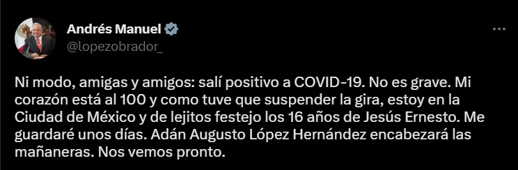 El presidente de México, Andrés Manuel López Obrador, ha anunciado que ha dado positivo por Covid-19 por tercera vez desde que comenzó la pandemia en el país. A través de su cuenta de Twitter, el mandatario informó que sus síntomas no son graves y que Adán Augusto López liderará las mañaneras mientras se recupera. El presidente también ha tenido que suspender su gira por Yucatán. Esta no es la primera vez que López Obrador ha contraído la enfermedad, ya que también dio positivo en enero de 2021 y en enero de 2022.