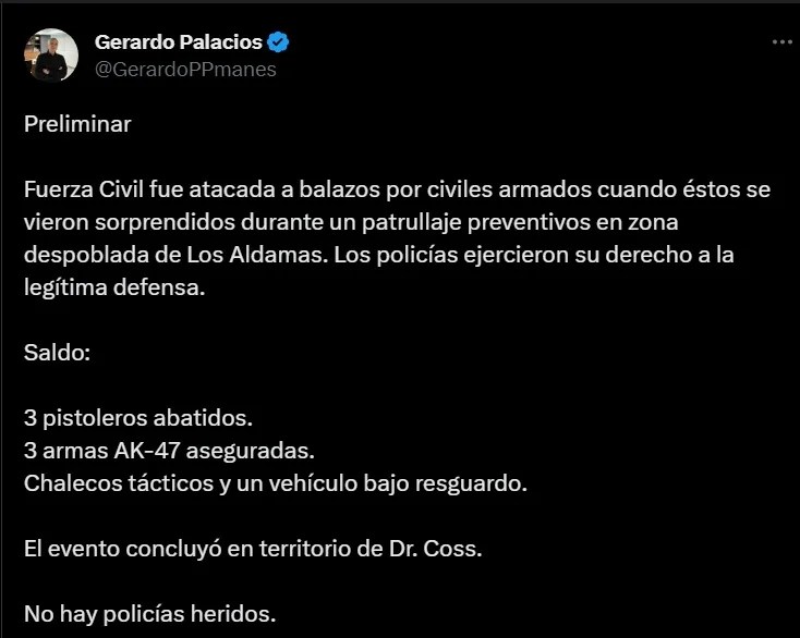 Elementos de Fuerza Civil fueron emboscados por hombres armados en una zona despoblada del municipio de Los Aldamas, según el reporte preliminar dado a conocer por Gerardo Palacios Pámanes, titular de Seguridad Pública estatal, a través de su cuenta de Twitter. Tras el ataque a balazos, los oficiales repelieron la agresión, lo que resultó en la muerte de tres pistoleros. Afortunadamente, no se reportaron heridos entre los agentes.