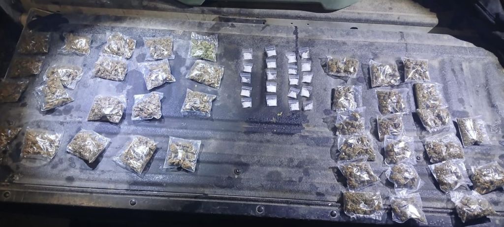 Durante la inspección precautoria, se incautaron dos armas largas con cargadores, 19 cartuchos útiles, 40 envoltorios de una sustancia con características similares a la marihuana y 20 bolsas de lo que podría ser cristal.