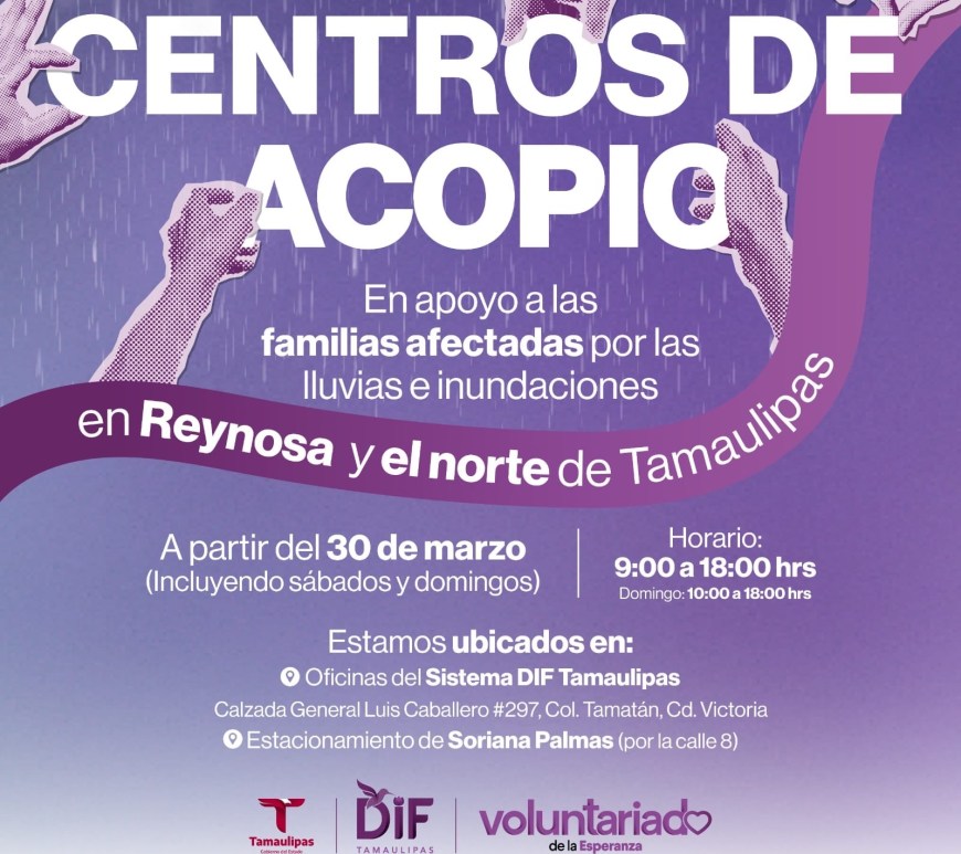 Ciudad Victoria.– Ante las severas lluvias e inundaciones que han impactado a Reynosa y otros municipios de la frontera norte de Tamaulipas, el Sistema DIF Tamaulipas, presidido por la doctora María de Villarreal, ha habilitado dos centros de acopio en la capital del estado para recibir donaciones destinadas a las familias damnificadas. A partir del domingo 30 de marzo, la ciudadanía podrá acudir a las … Continúa leyendo DIF Tamaulipas activa centros de acopio para familias afectadas por inundaciones