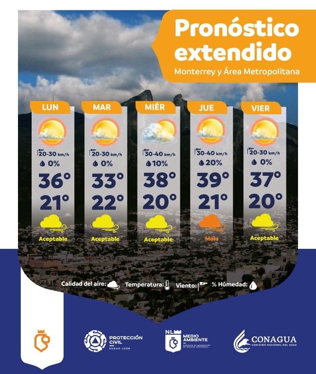 Monterrey, NL.- De acuerdo con el Servicio Meteorológico Nacional (SMN), se espera que las altas temperaturas persistan en el área metropolitana de Monterrey, con máximas que podrían superar los 36 grados Celsius.