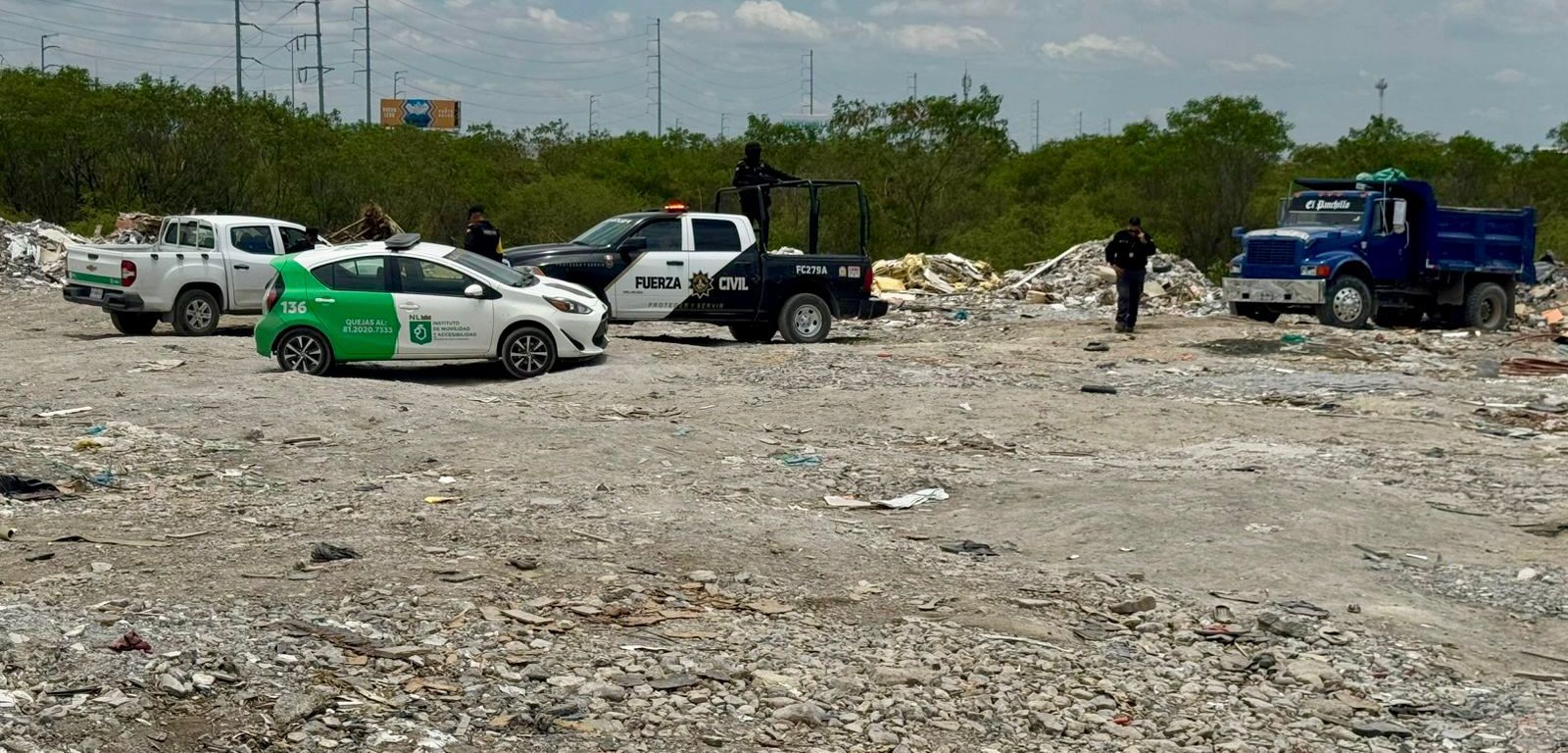 Juárez, NL.– Gracias a trabajos de investigación, la División Ambiental de Fuerza Civil detuvo a dos hombres que fueron sorprendidos mientras descargaban escombro en un tiradero clandestino del municipio de Juárez.