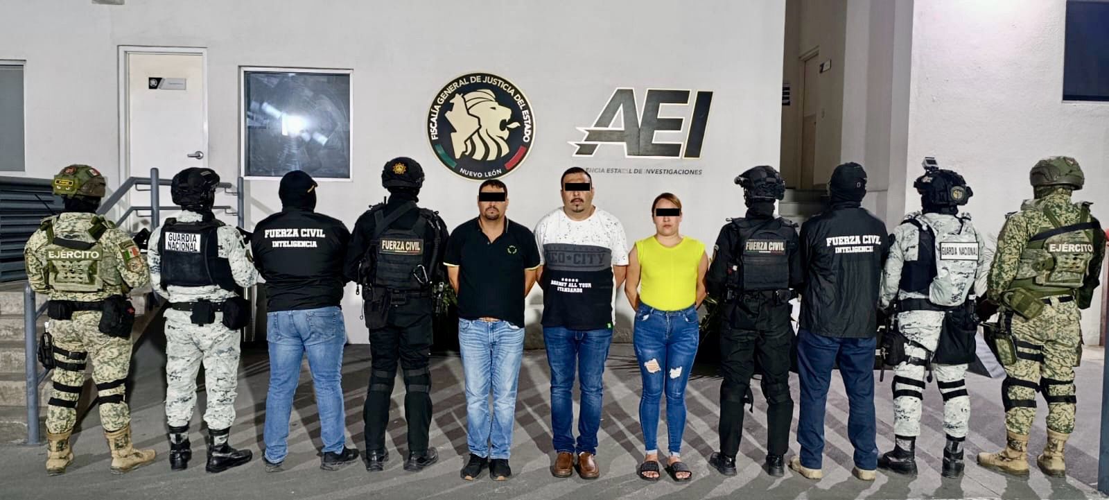 Posteriormente, en la colonia Centro, elementos de la Defensa, Guardia Nacional y Fuerza Civil montaron un operativo de investigación sobre un Nissan Versa localizado en avenida Apodaca–Huinalá. En el vehículo viajaban Juan “N”, de 27 años; Eduardo “N”, de 37; Alejandra “N”, de 24; Nancy “N”, de 47, y María “N”, de 51.