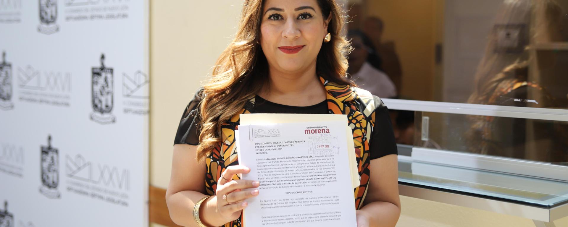 Monterrey, N.L.- La vicecoordinadora del Grupo Legislativo de Morena, Bere Martínez, presentó una iniciativa para homologar las tarifas aplicadas a los trámites de divorcios administrativos en las oficialías del Registro Civil de Nuevo León.