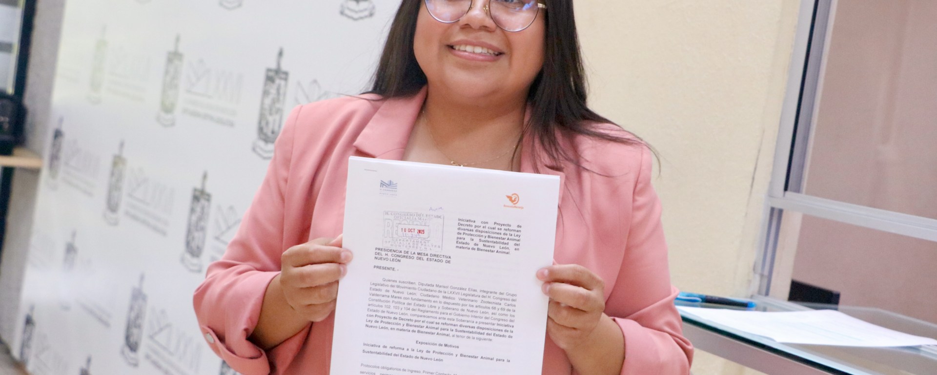 Monterrey, NL.– La diputada local de Movimiento Ciudadano, Marisol González Elías, presentó ante el Congreso del Estado una iniciativa de reforma a la Ley de Protección y Bienestar Animal para la Sustentabilidad de Nuevo León, con el propósito de establecer protocolos obligatorios en los Centros de Bienestar Animal y poner fin a la opacidad que ha derivado en casos de maltrato y abandono institucional.