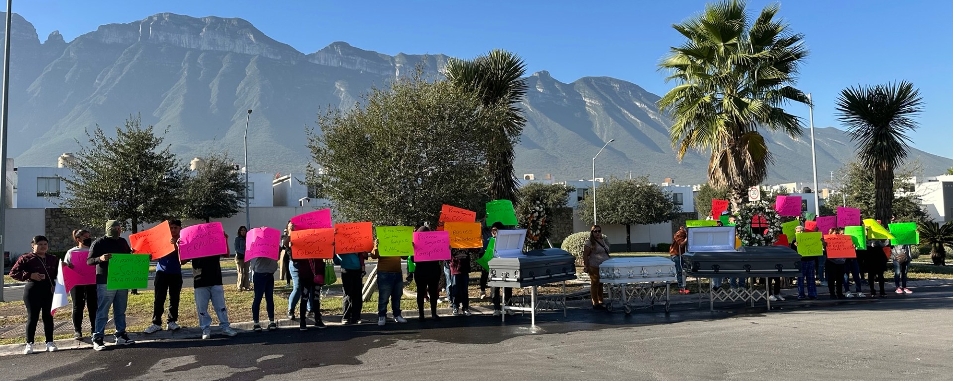 Monterrey, N.L.– Al ritmo de una banda sinaloense y con pancartas en mano, decenas de afectados por el presunto incumplimiento de las compañías aseguradoras irrumpieron en una privada del sur de Monterrey para “despertar” a uno de los directivos de Primero Seguros, señalado por no responder ante accidentes que, en algunos casos, han cobrado vidas.
