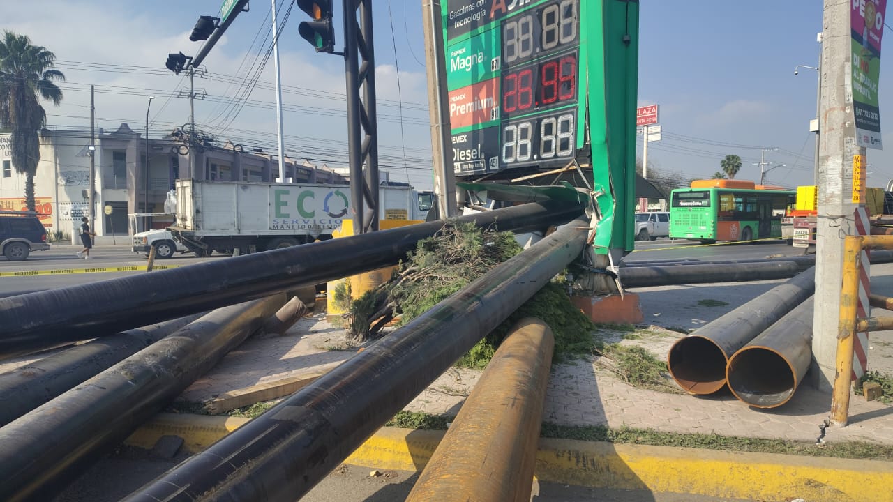 Apodaca, NL.— Un accidente vial se registró la mañana de este lunes 22 de diciembre de 2025 en el municipio de Apodaca, luego de que tubos de acero de gran longitud cayeran de un tráiler en circulación, impactando tres vehículos particulares y la estructura publicitaria de una gasolinera, sin que se reportaran personas lesionadas.