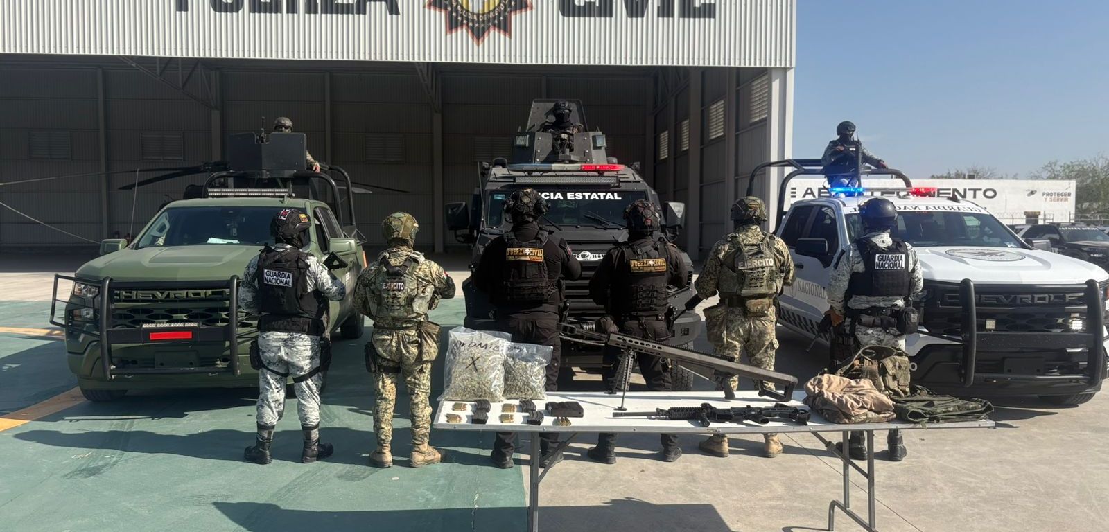 Al aproximarse al vehículo mediante estrategias tácticas policiales, localizaron en su interior dos armas largas, municiones, dos bolsas con hierba verde y seca con las características de la marihuana, así como chalecos balísticos y diverso equipo táctico.