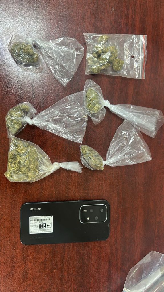Durante la inspección, los policías localizaron dos bolsas de plástico transparente con hierba verde con características similares a la mariguana en el portavasos del vehículo, además de otros cuatro envoltorios con la misma sustancia que llevaba en el pantalón.