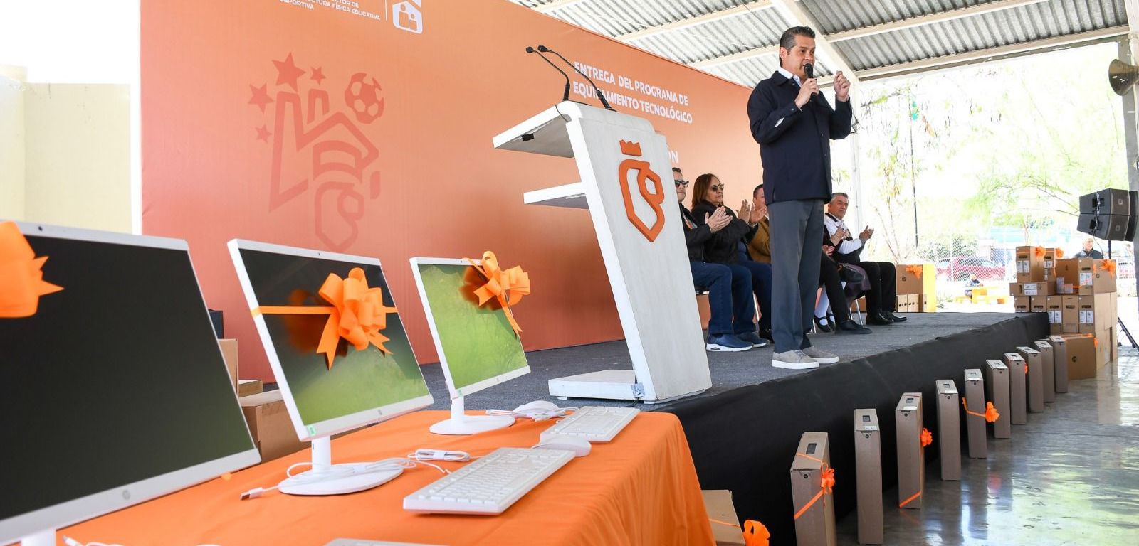 La entrega se realizó en la escuela primaria Derechos del Niño Neolonés, ubicada en la colonia San Bernabé, donde estudiantes, docentes y padres de familia recibieron los equipos tecnológicos.