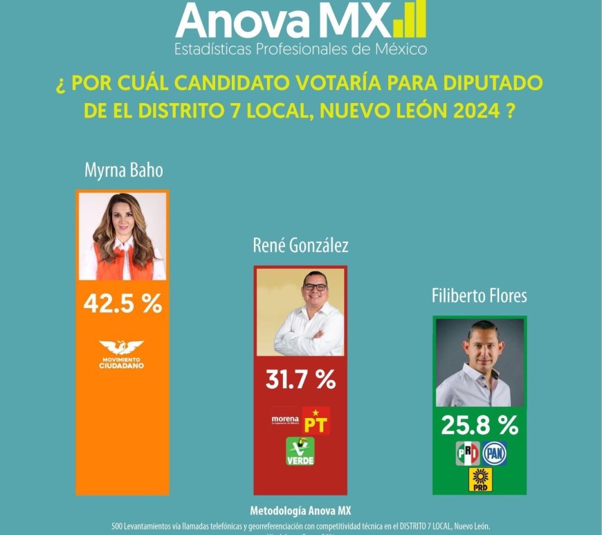 Apodaca.- Myrna Baho, candidata por Movimiento Ciudadano (MC) al distrito 7 local en Apodaca, continúa ganando terreno en las preferencias electorales, según las últimas encuestas realizadas por la encuestadora Anova Mx. Las encuestas muestran que Baho supera a sus competidores por márgenes significativos. En comparación con René González de Morena, la diferencia es del 10%, mientras que con el candidato del PRIAN, Filiberto Flores, la … Continúa leyendo Myrna Baho lidera en las preferencias electorales por el Distrito 7 local